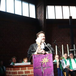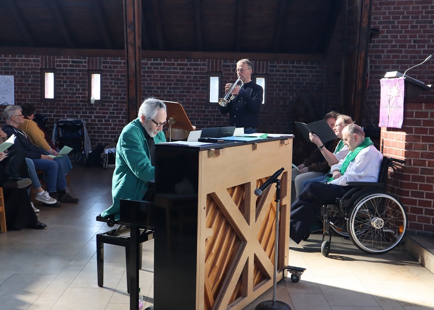 Zu Beginn spielten die Solisten, Leo Michalke am Klavier und Thomas Stählker auf der Trompete, eine wohlklingende Eingangsmusik. Passend dazu schien durch die Oberlichter der Kirche die Sonne – ein wunderbarer Tag für einen Neuanfang! Auch die Lieder des Gospelchores waren passend zum Thema ausgesucht: `Die Blumen blühen überall gleich´, `Zeige uns den Weg´, `Swing low´ – klatschend und singend fielen die Besucher in die Aufbruch-Stimmung ein.