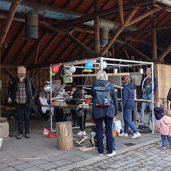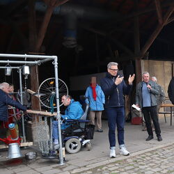 So waren dann auch Besucher*innen, die sich an der Protestaktion zur Gleichstellung von Menschen mit Behinderung beteiligen wollten, im Vorfeld von Nina Rohe, Fundraising und Projektmanagement bei der Westfalenfleiß GmbH und Initiatorin der Workshops, dazu aufgefordert worden, während der Veranstaltung ihre alte Fahrradklingel gegen eine neue einzutauschen. Davon machten etliche Menschen gerne Gebrauch. Die alte Klingel durfte nach der offiziellen Einweihung schließlich als Teil der akustischen Klangcollage zusätzlich an das Gerüst montiert werden. Am Ende beteiligten sich so viele – insbesondere Kinder - mit sichtlicher Freude an einem herrlichen Konzert aus Trommeln, Klingeln und verschiedensten Tönen und Klängen, die weit über das Hofgelände schallten.