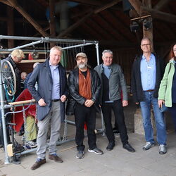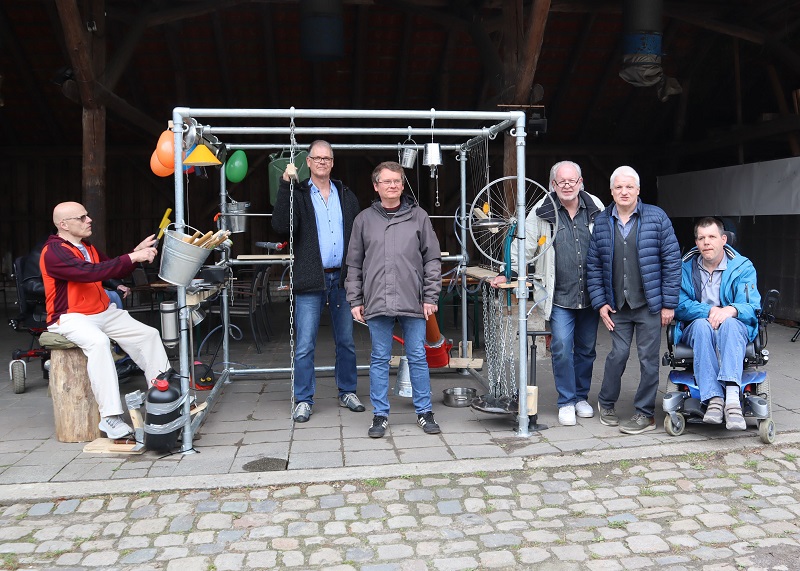 Benzinkanister, Blumentöpfe, Lampenschirme, Fahrradfelgen, Ketten und Thermoskannen – mit einem bunten Sammelsurium aus alten Metallgegenständen hatte ein inklusives Team unter der Leitung des Künstlers Thomas Gerhards zusammen mit der stellv. Einrichtungsleitung des Wohnhauses Gut Kinderhaus, Martina Fehnker, als Mitorganisatorin, an drei Wochenenden im April eine Klangskulptur kreiert. Die fertige Installation wurde nun auf dem Westfalenfleiß-Bauernhof Gut Kinderhaus feierlich eingeweiht. Mit Holzschlegeln und Schneebesen gaben die Workshop-Teilnehmenden zu Beginn ein Konzert. „Das ist heute sozusagen eine Welt-Uraufführung“, erklärte Jochen Koeniger, Künstler und ehemaliger Kurator der Ausstellung `Kunst am Rand´ schmunzelnd. „Diese Klangskulptur wurde von allen Beteiligten gemeinsam entwickelt und gebaut. Heute wird sie zum ersten Mal der Öffentlichkeit präsentiert und soll einen festen Standort auf dem Hof bekommen. Sie reiht sich damit gut in die bereits seit längerem hier installierten weiteren Kunstwerke ein.“ Ausdrücklich benannte er als Beispiel das Werk `Head Gardens´ an den Toren zur Hofscheune, das zwei Jahre zuvor von dem, auch an diesem Tag anwesenden Künstler Helmut Dick als Spende an Westfalenfleiß übergeben worden war.