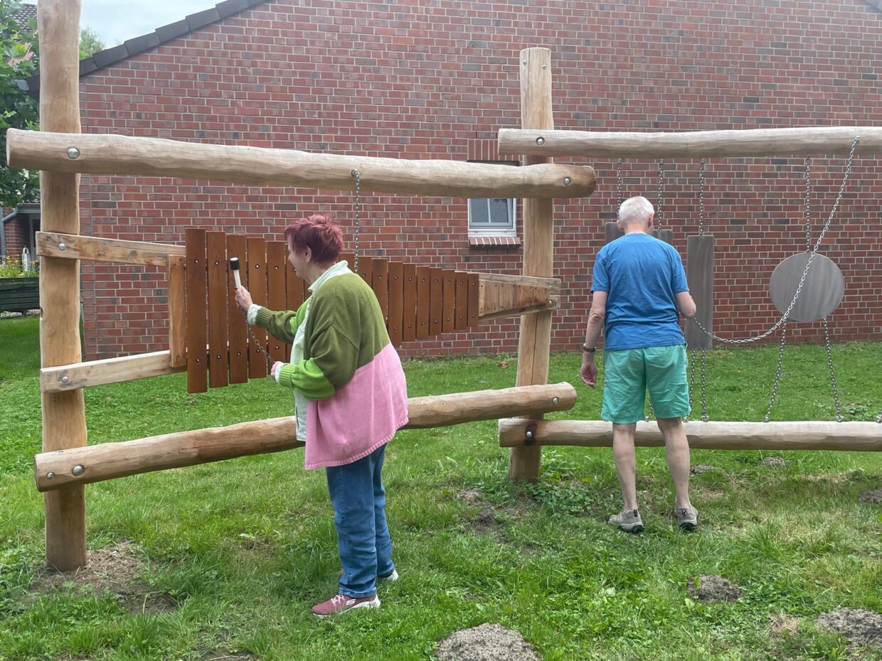 Die Einrichtungsleiterin Melanie Dylong und ihre Stellvertreterin Martina Fehnker begrüßten herzlich alle Bewohnerinnen und Bewohner wie auch das ganze Team und führten die große Klangwand im Garten vor. Die schönen Klänge begeisterten alle Anwesenden und sorgten für eine besondere Atmosphäre. Im Anschluss hatten die Bewohnerinnen und Bewohner die Möglichkeit, selbst kreativ zu werden und die Klangwand mit Xylophon auszuprobieren.