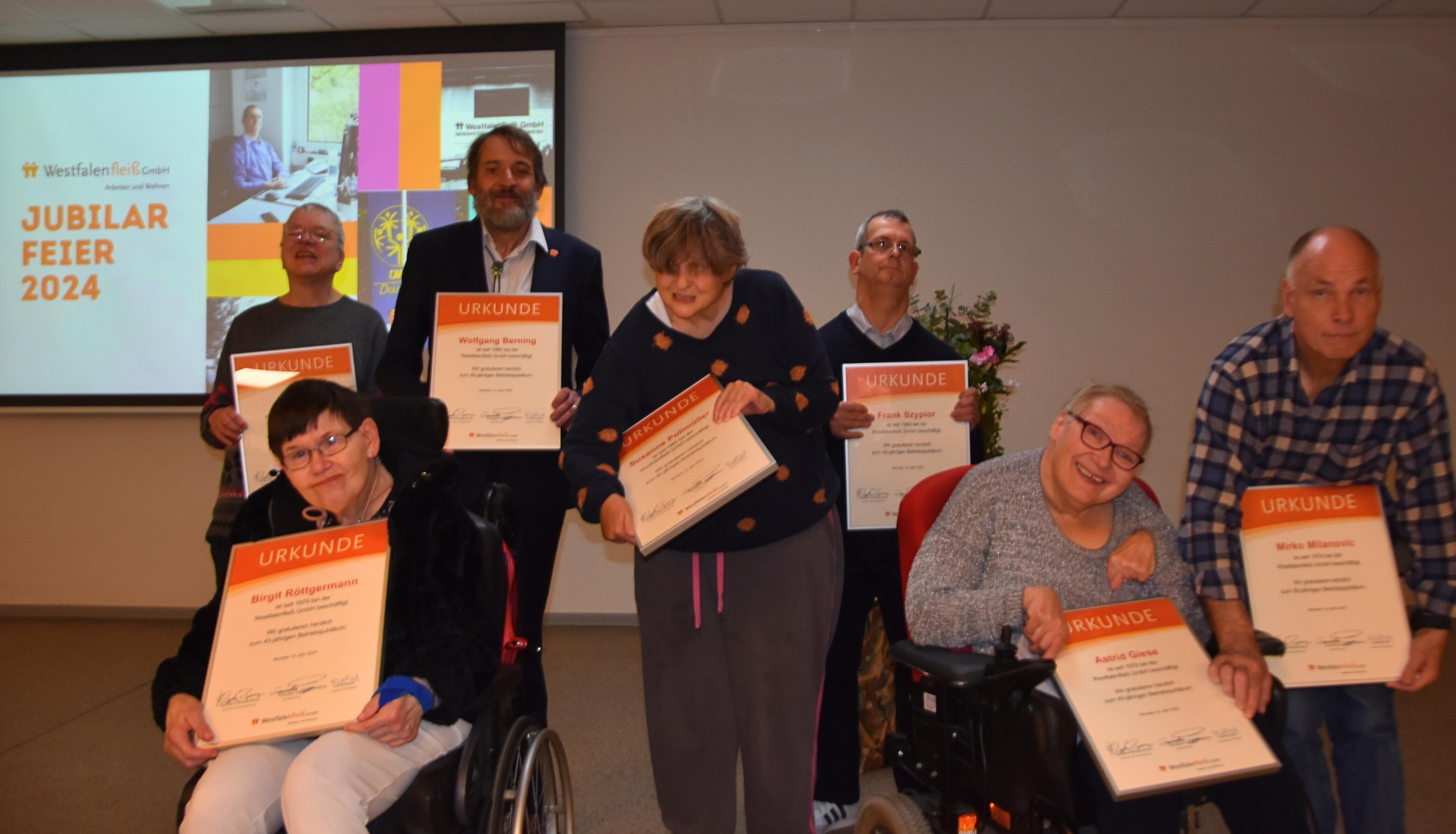 Zu Kaffee, Kuchen und Canapés trafen sich die Geehrten und ihre Wegbegleiter. Frank Szypior und Werner Pamme, Vorsitzende des Werkstattrats, begrüßten die Runde ebenfalls herzlich und bemerkten schmunzelnd: „Hier sitzt eine echte Wissensbank und eine große Portion Herzblut von Westfalenfleiß!“