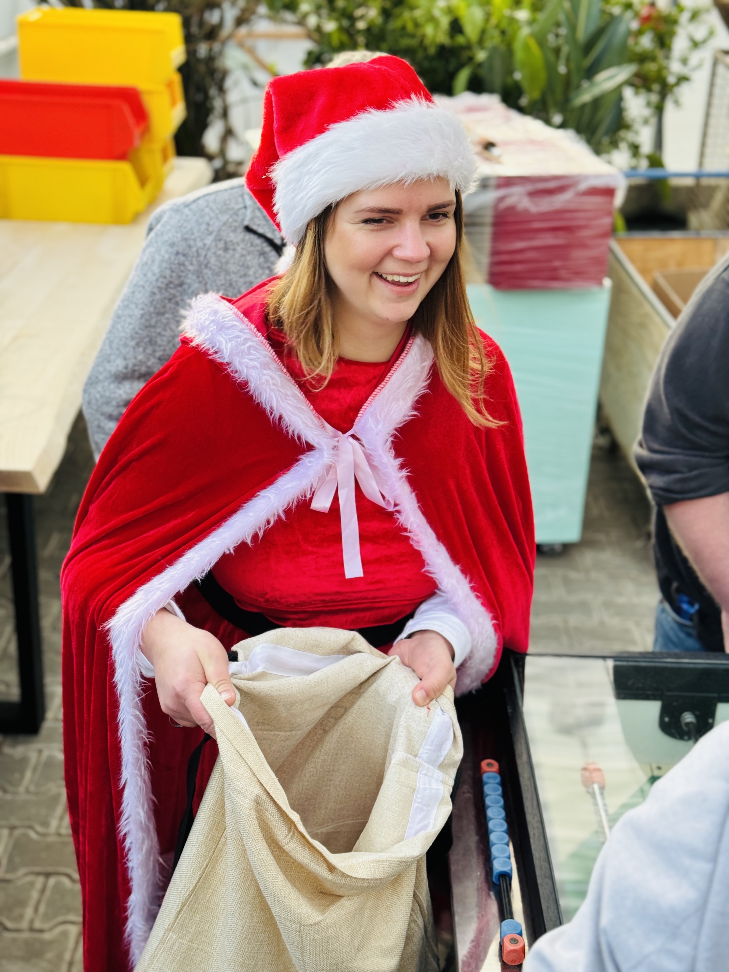 Nachdem mit einem gemeinsamen Frühstück in den Tag gestartet wurde, ging es für einige Beschäftigte in der Gärtnerei am Kesslerweg sportlich weiter: Ein Kickerturnier sorgte für jede Menge Spaß. Unsere Mitarbeiterin Julia Jasken war als Weihnachtsfrau mit einem Sack voller Süßigkeiten unterwegs – und verteilte nicht nur Leckereien, sondern sorgte auch für das eine oder andere Lächeln auf den Gesichtern.
